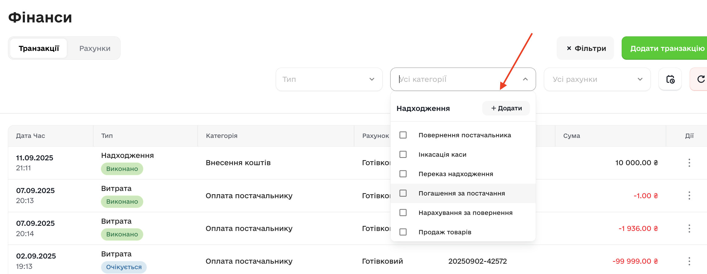 Оберіть Категорію (у кожного Типу транзакції - свої категорії)