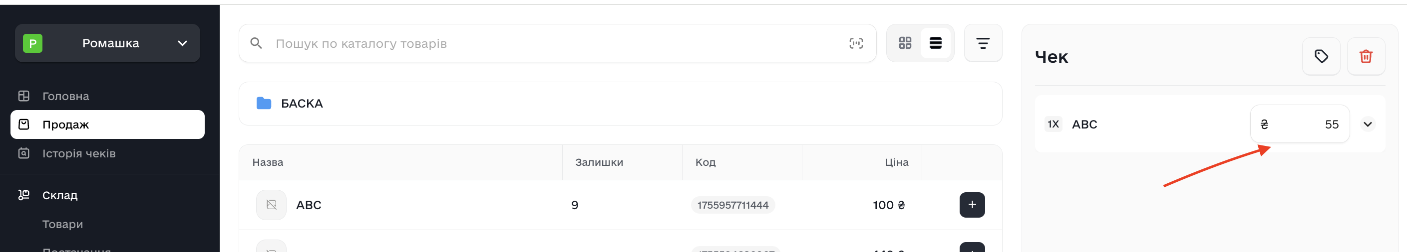 Щоб змінити ціну товару в чеку, додайте потрібний товар в чек і в полі ціна впишіть потрібну ціну продажу
