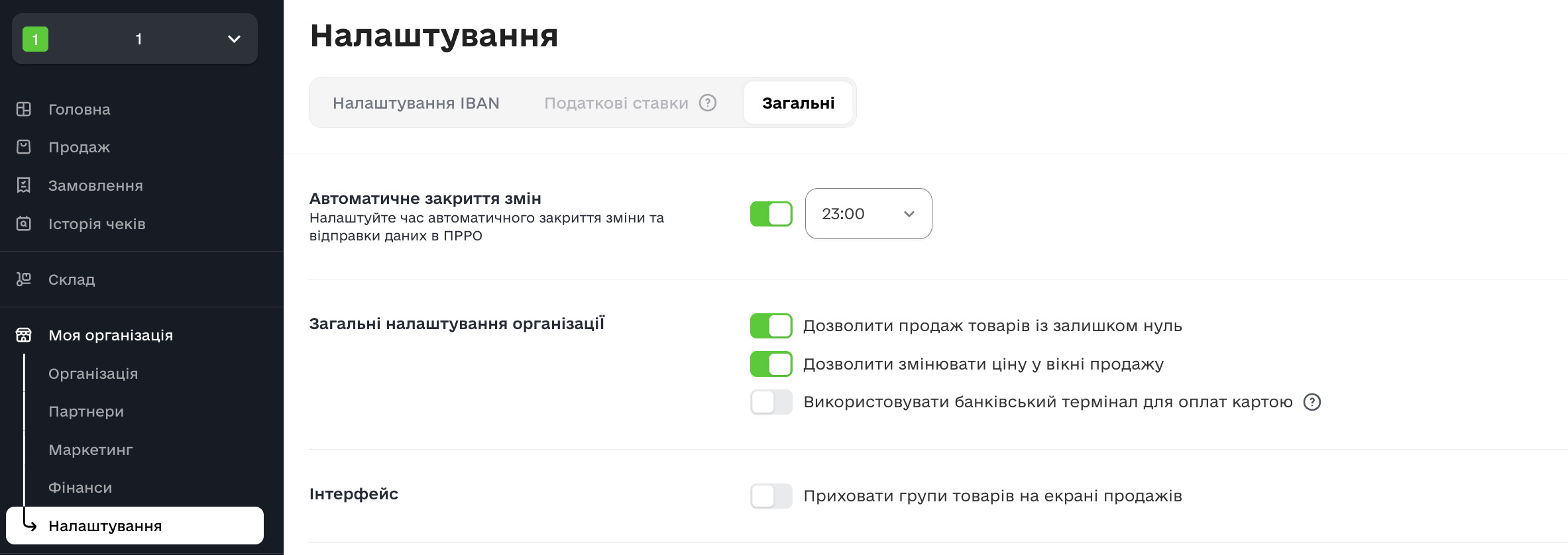 Для активації автозакриття перейдіть в розділ Моя організація - Налаштування - Загальні.